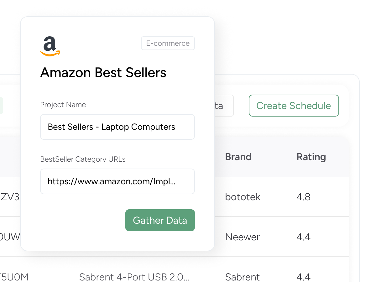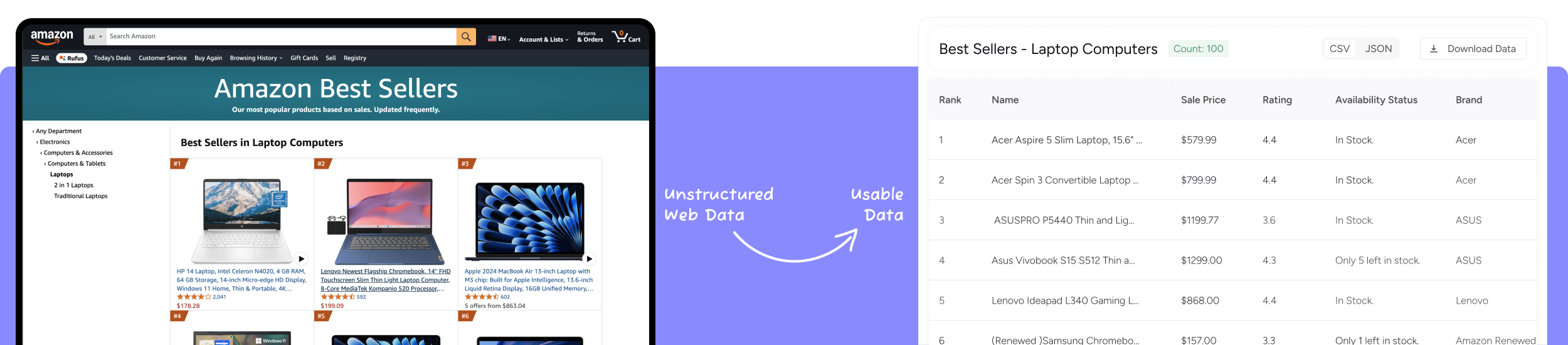 Extract product data of the most popular products from Amazon’s Best Seller page. Gather product details such as best seller rank, product name, pricing, rating, number of reviews, product images, and 15+ data points from Amazon.
