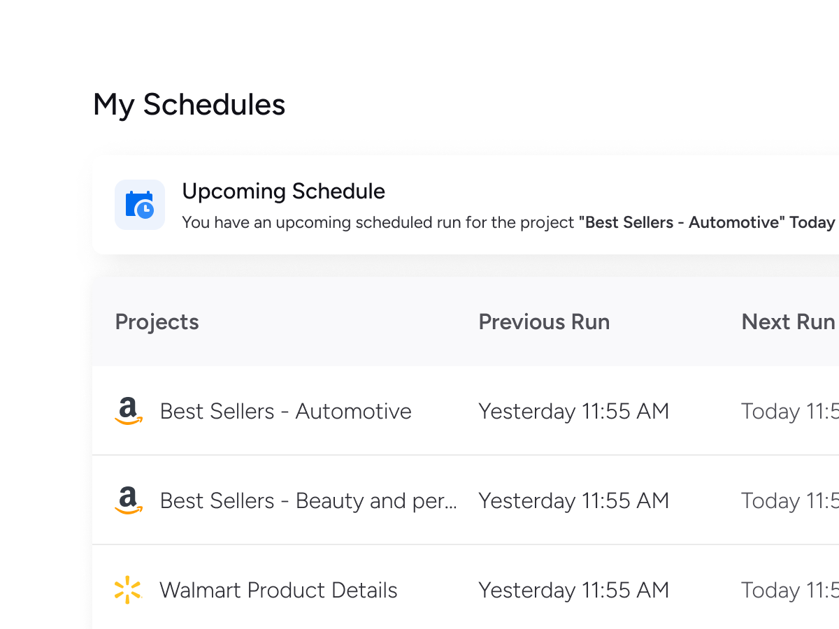 Schedule automated crawls to deliver fresh data to Dropbox, AWS S3, Google Drive, or to your app via API. Choose hourly, daily, or weekly updates to stay current.