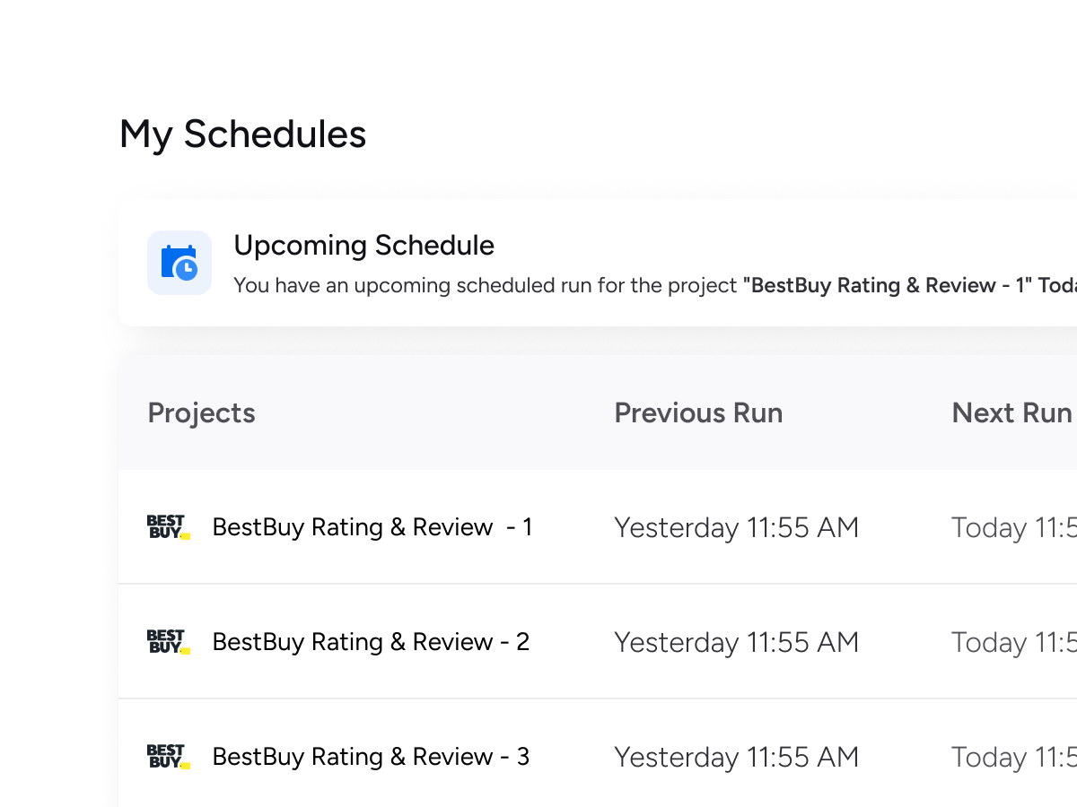 Schedule automated crawls to deliver fresh data to Dropbox, AWS S3, Google Drive, or to your app via API. Choose hourly, daily, or weekly updates to stay current.