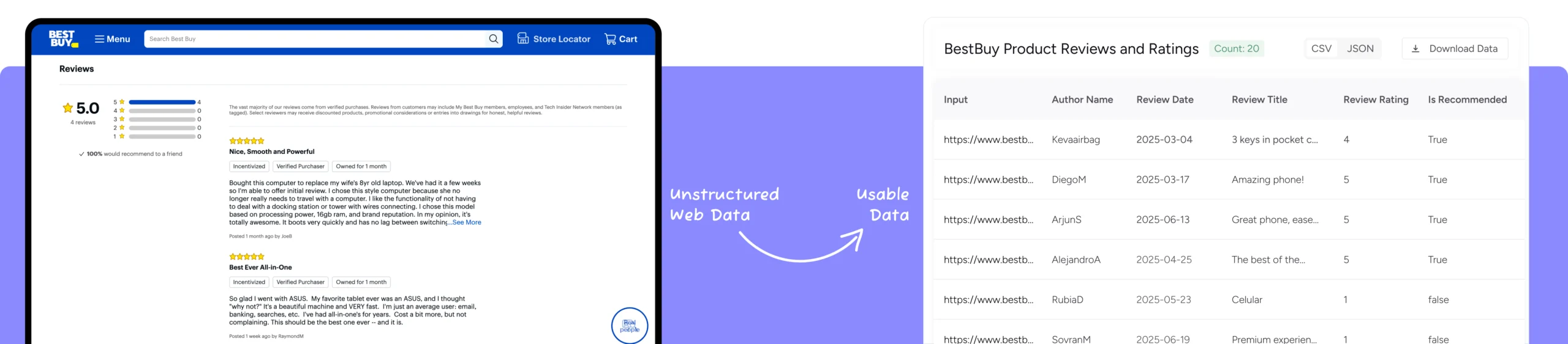 Extract product reviews from Best Buy. Gather review and rating data, including product name, reviews, ratings, review text, author, and 15+ additional data points, from Best Buy.