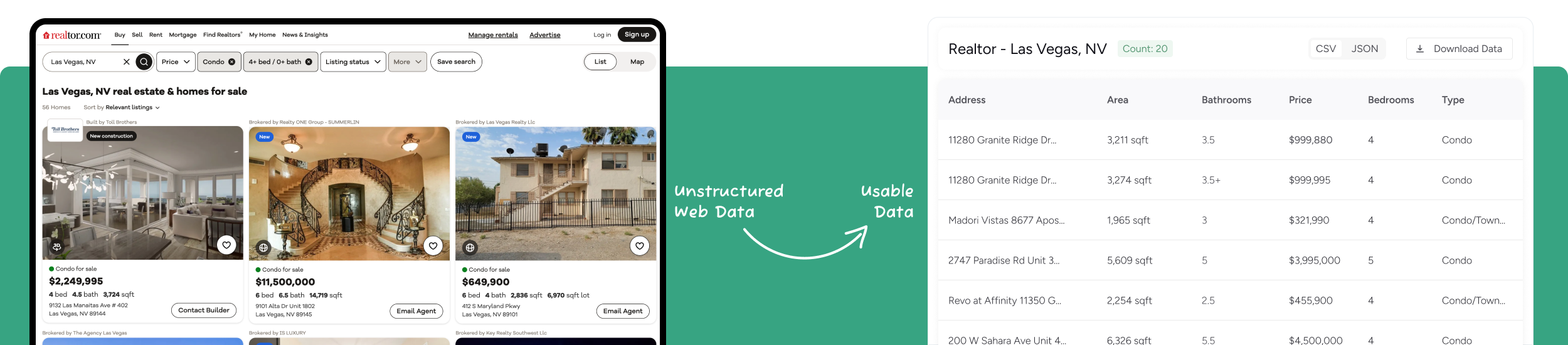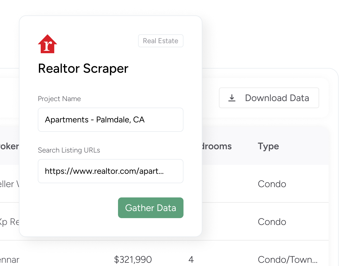 Download real estate listings from the Realtor search results page. Just provide the Realtor search results URLs to extract property listings, and the scraper will get you the updated real estate data from Realtor in a spreadsheet.