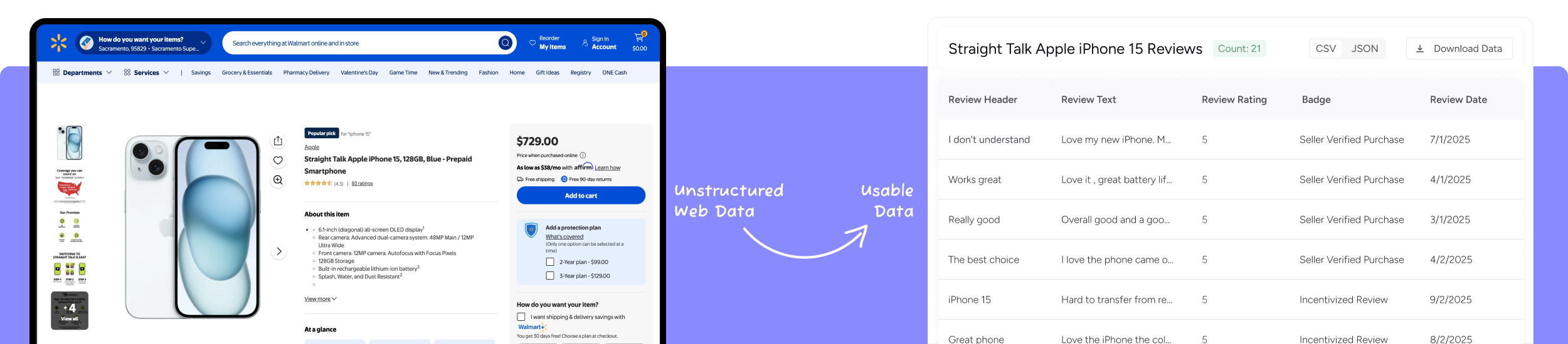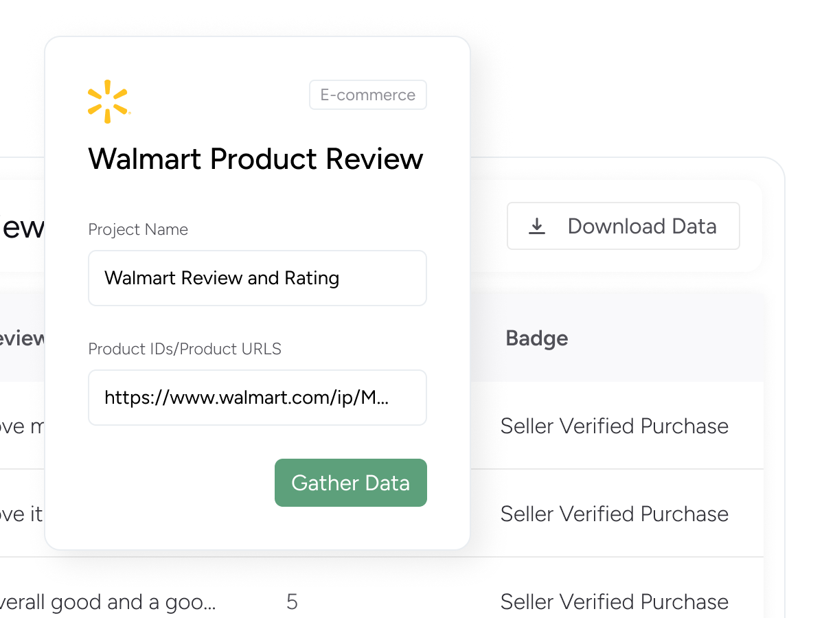 Gather customer reviews for a particular product on Walmart within minutes. Just provide a product or review URL.