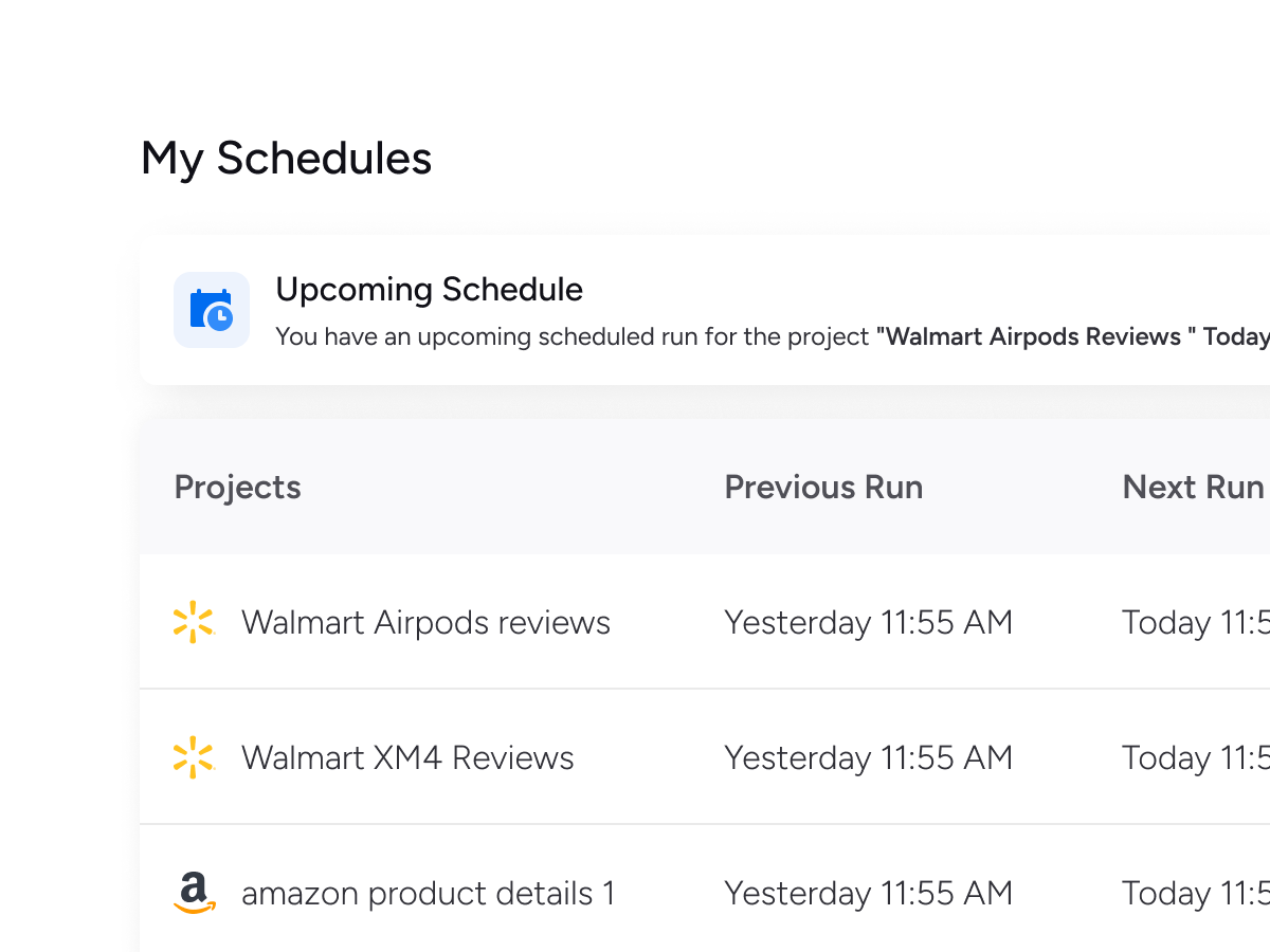 Schedule the crawlers to run hourly, daily, or weekly and get data delivered to your Dropbox.