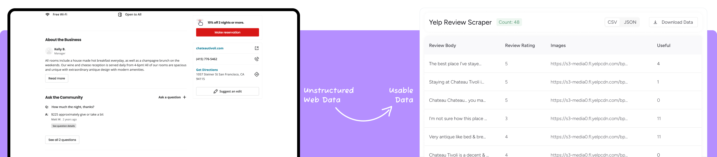 Extract business reviews from Yelp. Gather review information about businesses such as review author, aggregate rating, review rating, date created, reviews and more data points from the Yelp business page.